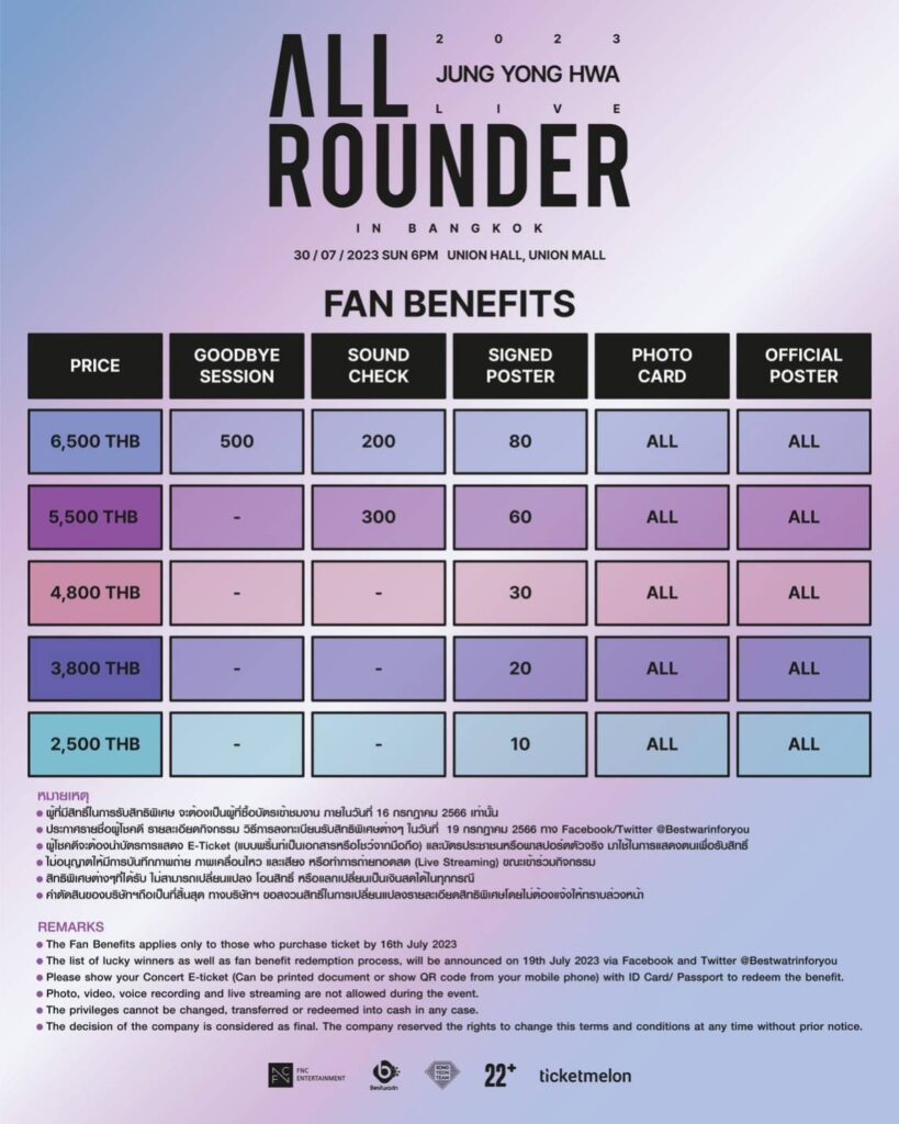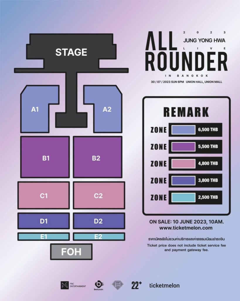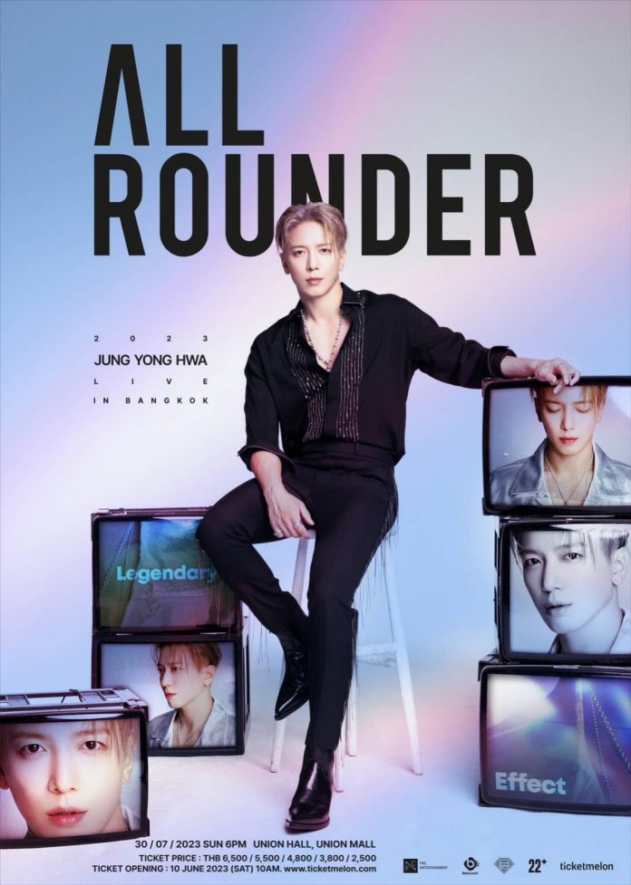 โดยในคอนเสิร์ตครั้งนี้หนุ่มยงฮวาก็ไม่พลาดที่จะกลับมาประเทศไทยในรอบหลายปีเพื่อมาเขย่าใจแฟนๆ บอยซ์ไทย ต้องโดนตกอีกครั้ง!!! ใน “2023 JUNG YONG HWA LIVE ‘ALL-ROUNDER’ IN BANGKOK” วันอาทิตย์ที่ 30 กรกฎาคม 2566 เวลา 6 โมงเย็น ณ ยูเนี่ยนฮอลล์ เปิดจำหน่ายบัตร : วันเสาร์ที่ 10 มิถุนายน 2566 ตั้งแต่เวลา 10.00 น. เป็นต้นไป ทางเว็บไซต์ www.ticketmelon.com บัตรราคา 6,500 / 5,500 /4,800 / 3,800 และ 2,500 บาท