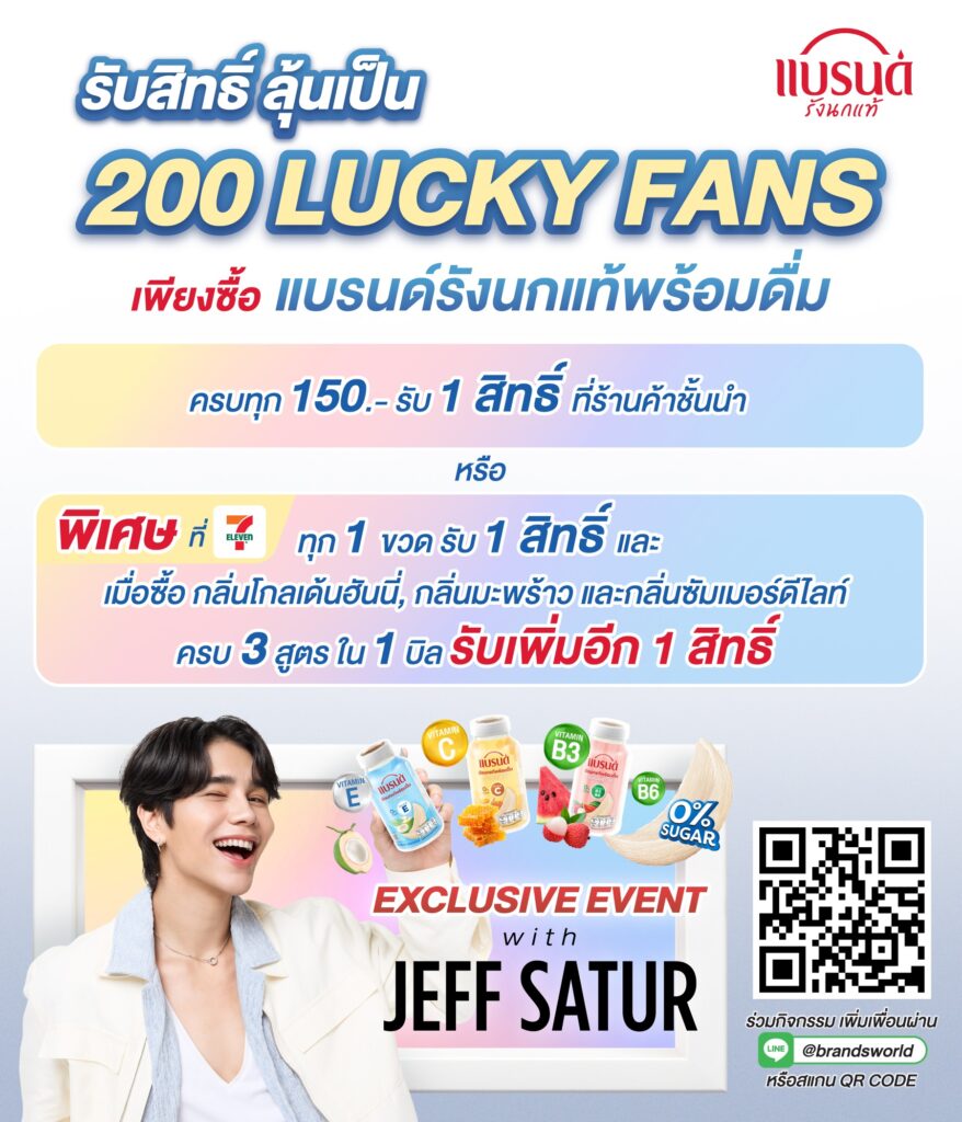 กิจกรรมสุดเอ็กซ์คลูซีฟกับเจฟ ซาเตอร์ จะจัดขึ้นในวันที่ 8 สิงหาคม 2568 ที่ SF World Cinema, Central World โดยบริษัทฯ จะประกาศรายชื่อผู้โชคดีทั้ง 200 คน ในวันที่ 30 กรกฎาคม 2568 เวลา 18.00 น. ทาง Facebook Brand’s World Thailand ผู้ที่สนใจสามารถติดตามรายละเอียดของกิจกรรม หรือสอบถามข้อมูลเกี่ยวกับผลิตภัณฑ์ได้ที่ Facebook: Brand’s World Thailand หรือ Line Official Account @brandsworld